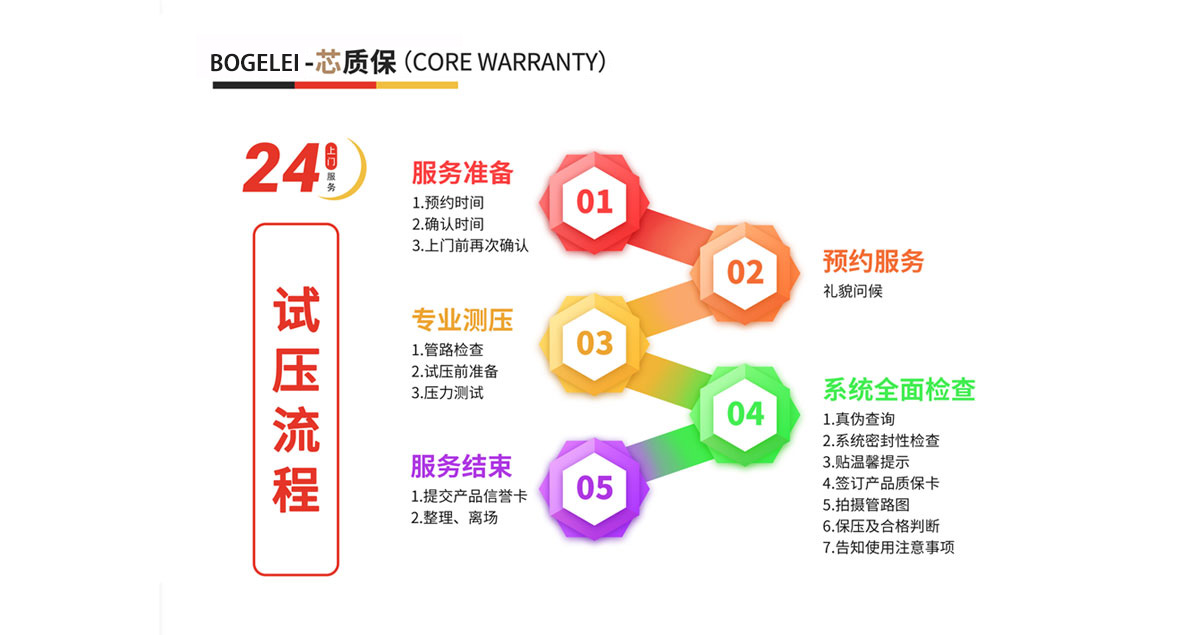 BOGELEI系列管材、管件在正常工作环境下,终身质保(BOGELEI铜管件分集水器、球阀类产品质保五年,五年之内,免费维修与更换,通过芯质保验收合格后,在产品使用期内,我公司对产品质量及焊接质量负责,确因产品存在质量问题,公司将无条件换货或退货,因产品质量或焊接质量造成的用户损失由我公司负责赔偿,但因防护不当、不同厂家及不同材料产品混装和天气等不可抗力因素导致管道受损等原因造成的损失,热熔承插不垂直,热熔承插深度不达标我公司不予负责。 我公司对产品实行售前、售中、售后服务,在此过程中出现的任何问题,请拨打售后服务电话,我们将给您满意的处理结果。 此卡*终解释权归本公司所有。